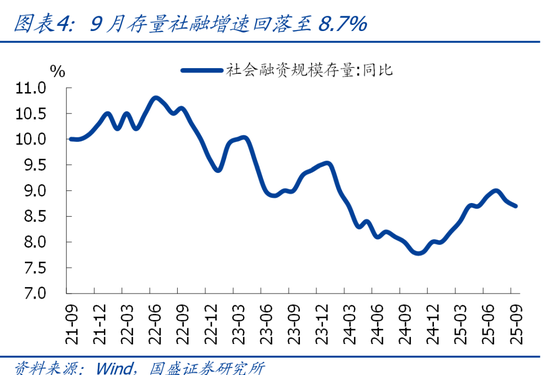 事件:2025年9月新增人民币贷款1.29万亿,前值5900亿,预期1.39万亿,去年同期1.59万亿;新增社融3.53万亿,前值2.57万亿,预期3.28万亿,去年同期3.76万亿;存量社融增速8.7%,前值8.8%;M2同比8.4%,前值8.8%;M1同比7.2%,前值6%。