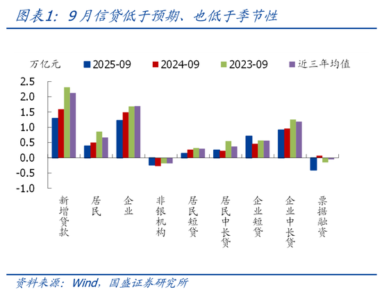 >总量看,9月新增信贷1.29万亿,同比少增3000亿,明显低于季节性(近三年同期均值为2.12万亿),也低于预期(市场预期1.39万亿)。其中,居民贷款增加3890亿,同比少增1110亿;企业贷款增加1.22万亿,同比少增2700亿;非银贷款减少2348亿,同比少减356亿。