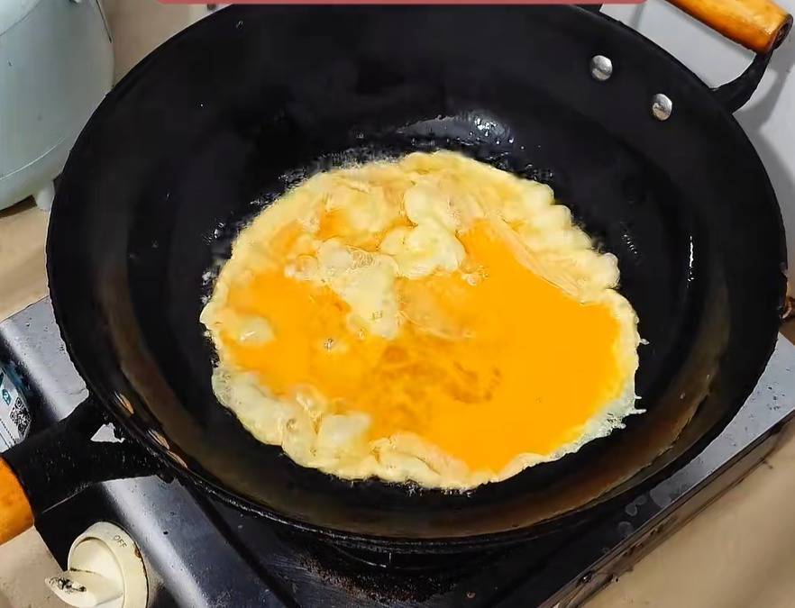 5:另外起锅,锅底烧热到冒烟,加适量的食用油,油温变到7成热,倒入调好的鸡蛋液,让鸡蛋两面煎至成型,用锅铲翻炒均匀,分为一些小块,装在碗中备用。