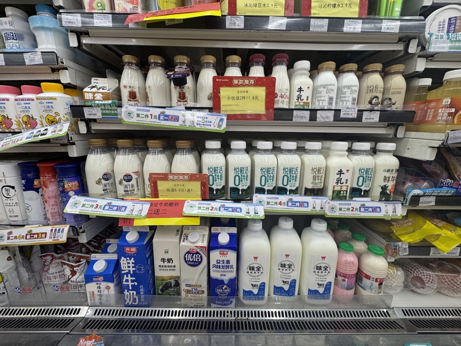 某便利店冷藏柜在售的20余款乳制品中,有5款标注为“高温杀菌乳”,来自不同品牌。